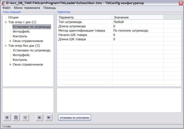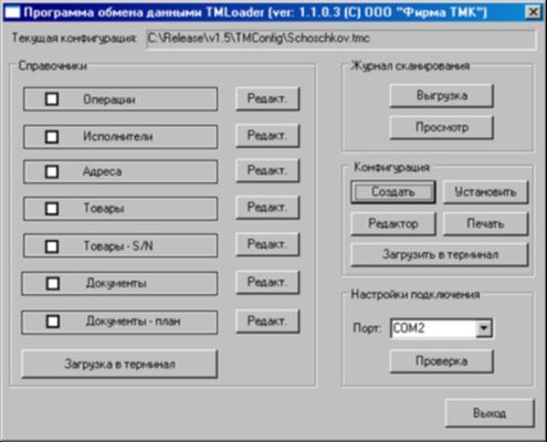 Он позволяет подключиться к базе данных заказчика и осуществлять с ней обмен данными напрямую или через файловый обмен. Стандартная поставка содержит 3 модуля: модуль для терминала TMScan, библиотека обмена данными с терминалом telecom.dll и загрузчик TMLoader. Расширенная поставка (рекомендуется только для опытных пользователей) содержит дополнительно конфигуратор TMConfig, предназначенный для создания и редактирования конфигурации tmscan. Инструкцию (pdf) можно посмотреть здесь.